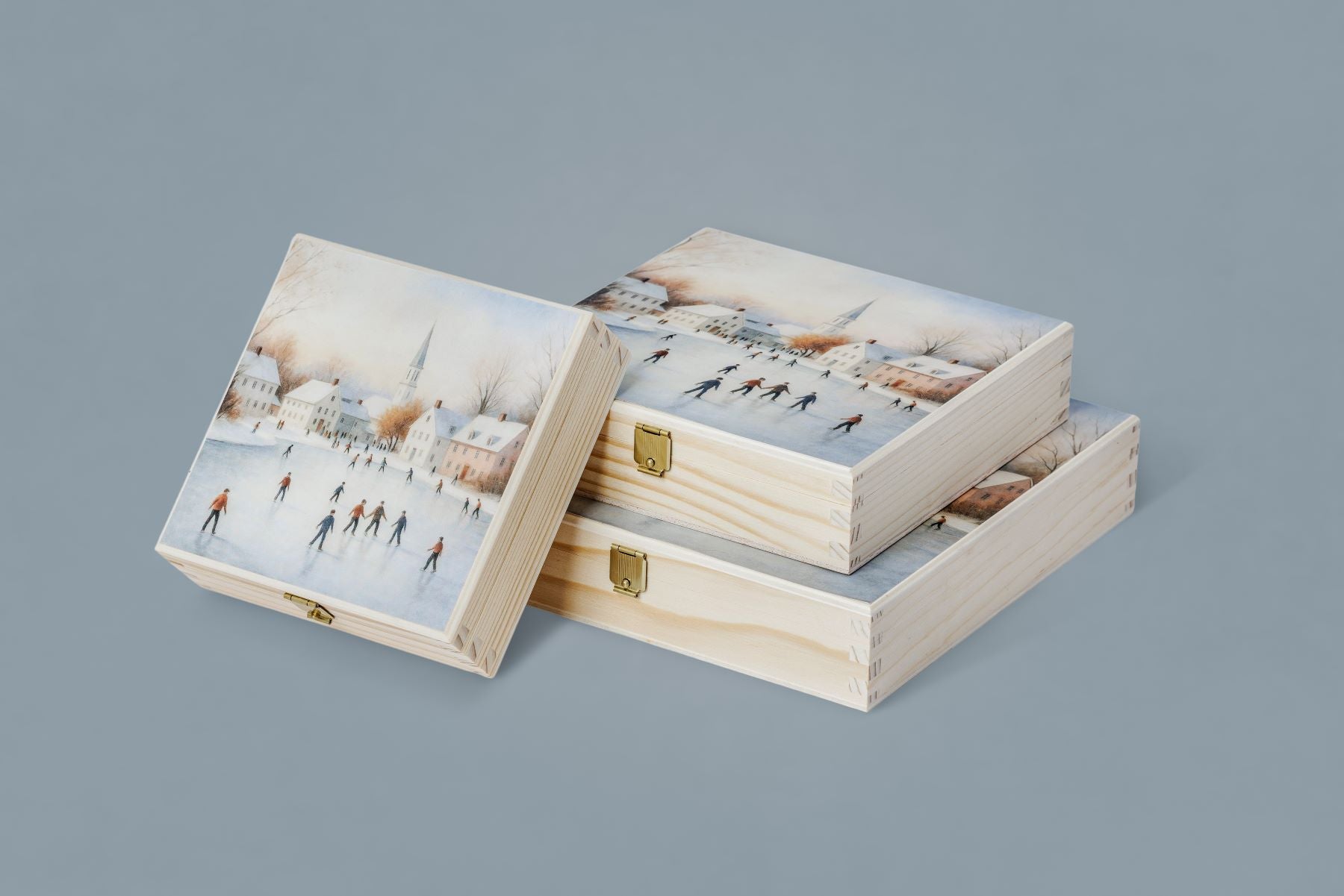 Schachteln aus Holz mit Wintermotiv